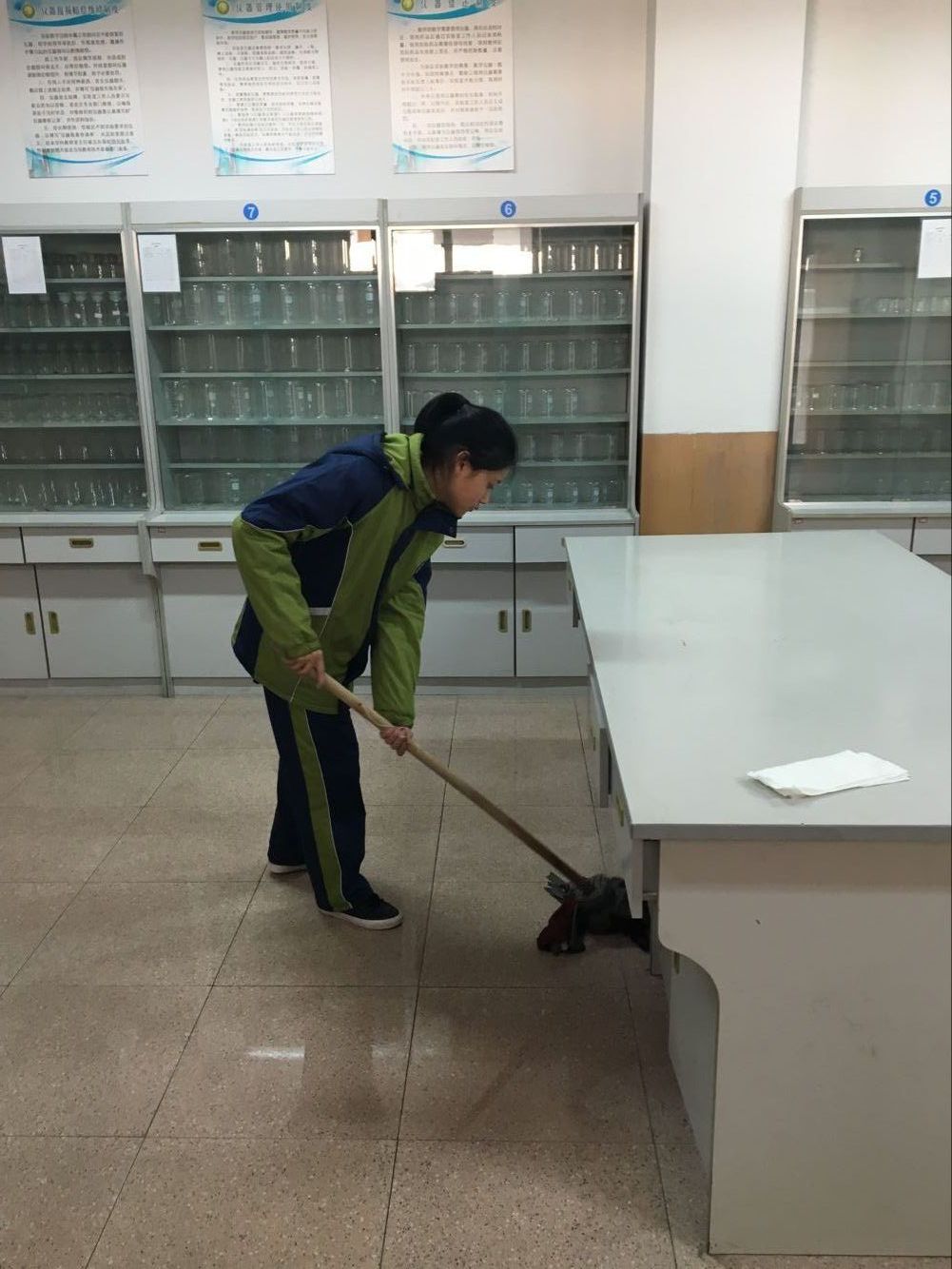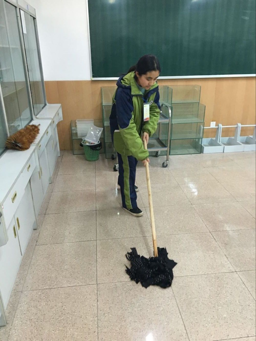 拖地就由同伴来完成。接着,我们就开始擦桌面。每一张蓝色桌面上的污痕都被我给施了“魔法”,全消失了,只留下一份干净,一份整洁。然后,就只剩下洗水池了,水池里很脏。最初的时候,必须要放些水“湿润”一下,再用抹布把里面的脏东西擦干净,最后再用水冲一遍,把水池旁的水吸干才算完成了任务。