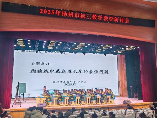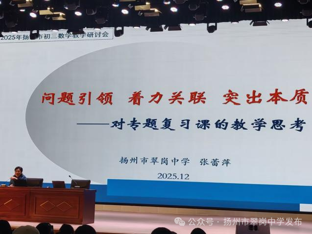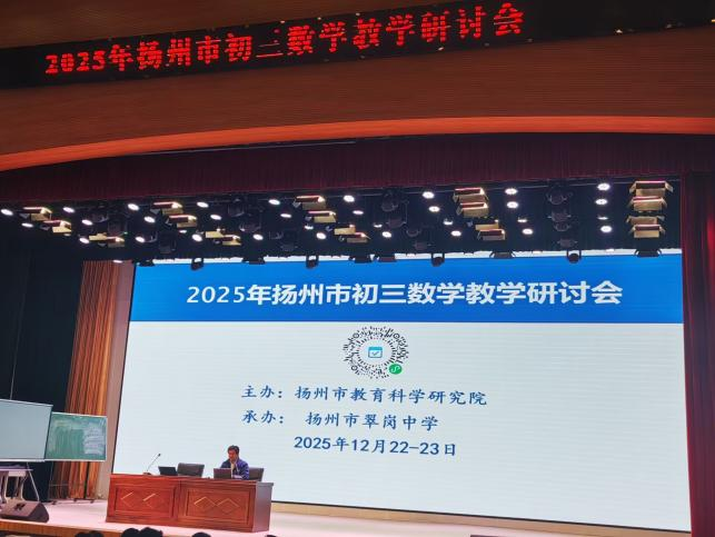 2025年12月22日至23日,由扬州市教育科学研究院主办、扬州市翠岗中学承办的2025年扬州市初三数学教学研讨会在翠岗中学顺利举行。来自全市的初三数学教师齐聚一堂,围绕初三数学复习课教学展开深度研讨,共同探寻高效教学路径,为提升全市初三数学复习质量凝聚智慧与力量。
